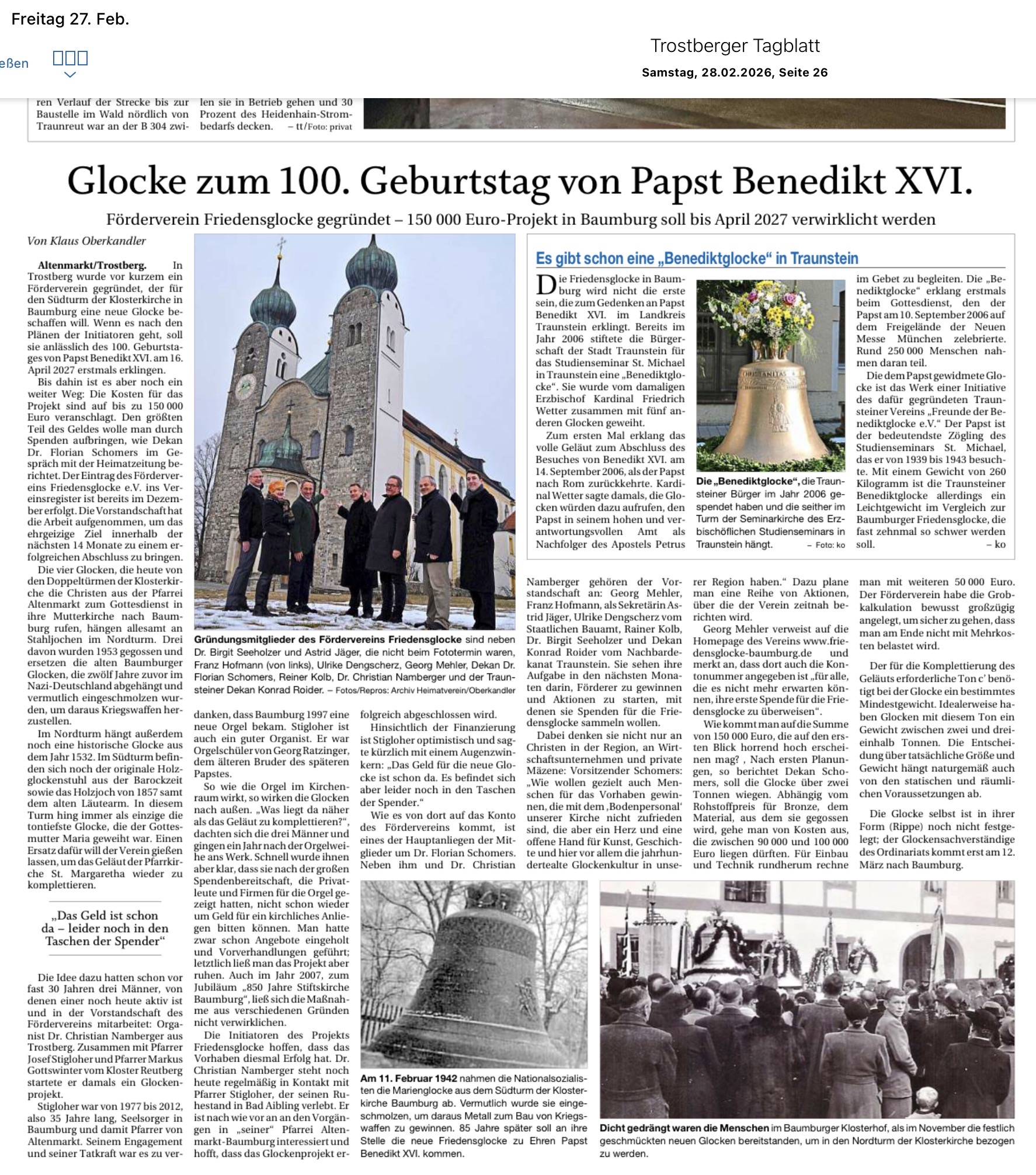 Zum 100. Geburtstag von Papst Benedikt XVI. im April 2027 soll eine große Glocke geweiht werden, die das bisherige Geläute der Stiftskirche Baumburg vervollständigen wird.
